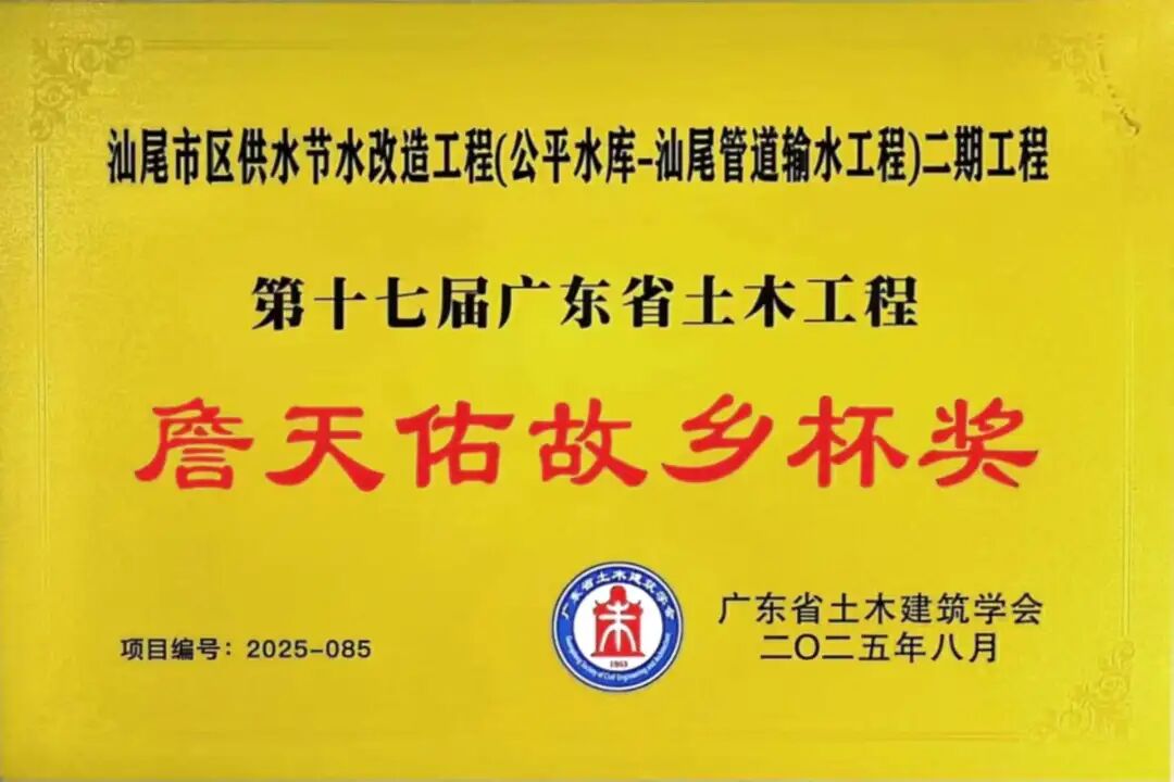 近日,粵海水務建設的汕尾市區供水節水改造工程二期項目經廣東省土木建筑學會評定,榮獲第十七屆土木工程“詹天佑故鄉杯獎”。該獎項設立于2009年,是廣東省土木建筑工程領域科技創新的最高榮譽,旨在表彰在科技創新與新技術應用中表現突出的工程項目及主要創新人員。